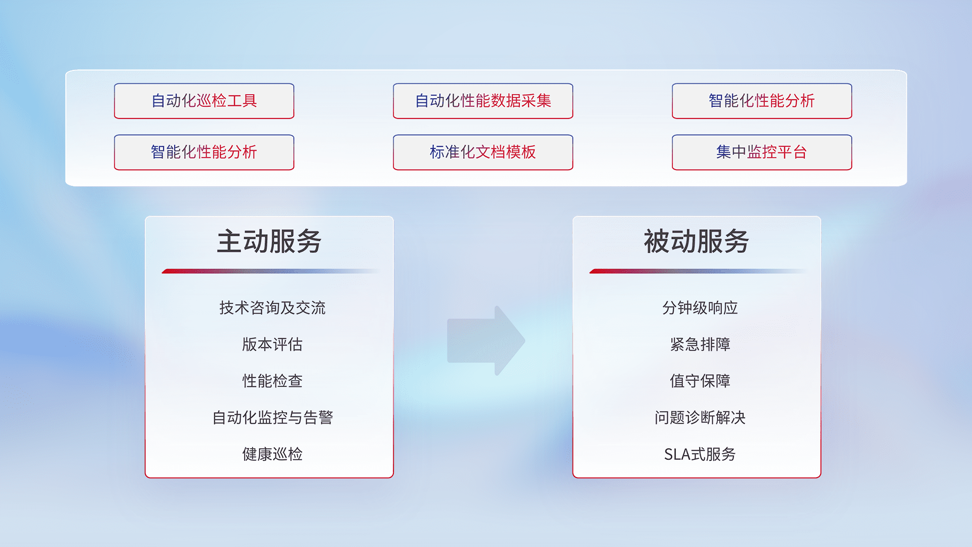 智能化工具和标准化文档,,,,保障服务质量,,提供主动服务(包含技术咨询、、版本评估、、性能检查、、自动化监控与告警、、、、健康巡检)和被动服务包含(分钟级响应、、紧急排障、、、、值守保障、、问题诊断解决、、SLA服务)。。